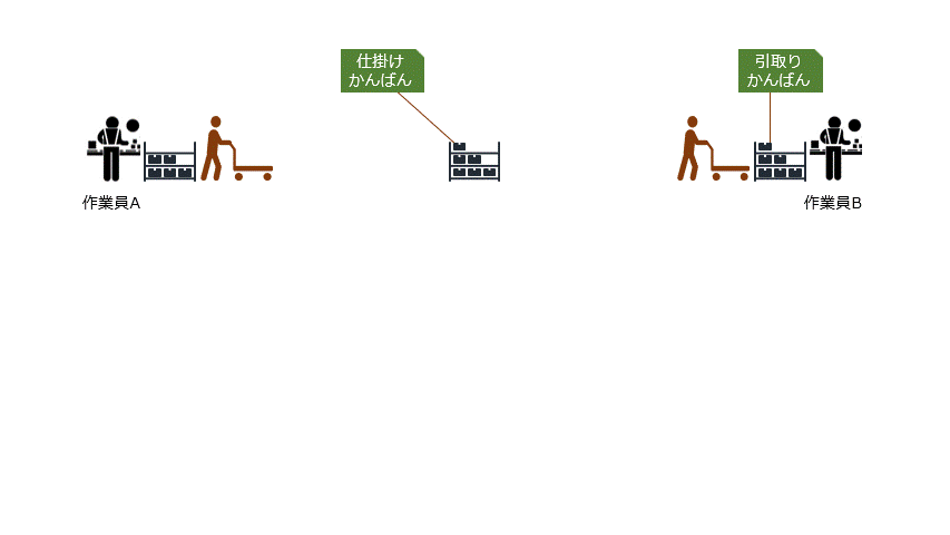 このようなMRP生産方式に対して、顧客からの注文や、後工程での部品の使用実績に応じて、「必要なものを」「必要な時に」「必要な量だけ」 自律的に作り、補充する生産方式を“後補充生産”や“かんばん”といいます。この方式では、後工程(顧客に近い工程)が必要な部品を引き取りにいくことで、前工程に生産指示を出します。